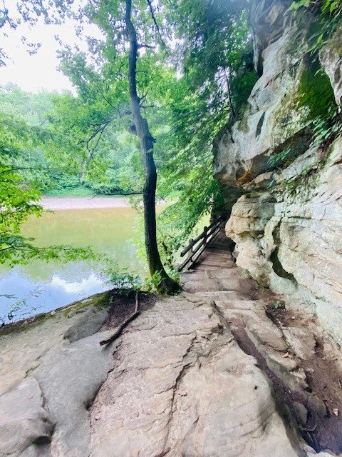 Below is a view from the suspension bridge where the rocky beach area is located. One images shows it on a sunny weekend and the other was an evening during the week after a rain storm had cleared. Since this is one of the most popular state parks in Indiana, here are some tips to avoid crowds, if you prefer a quieter hiking experience.